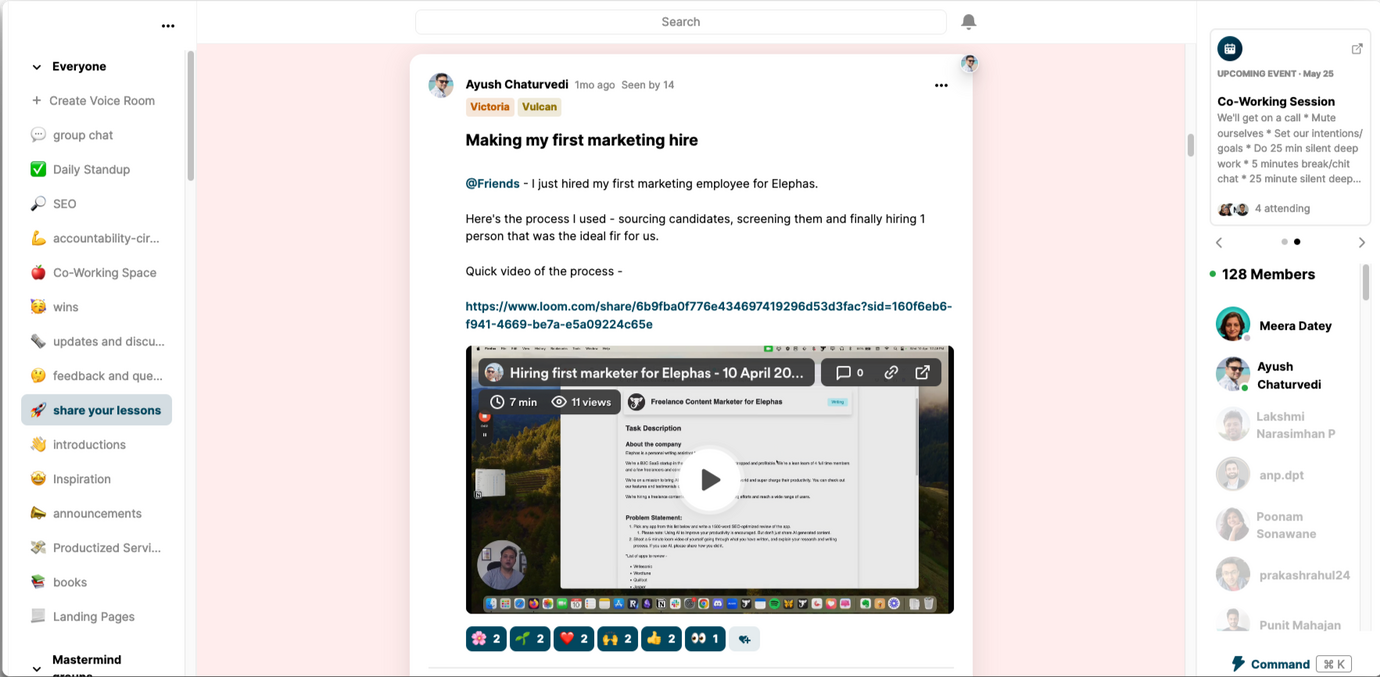 Members are active and share openly, making the community engaging. Ayush pushes us to set monthly goals and hold us accountable for our deliverables.