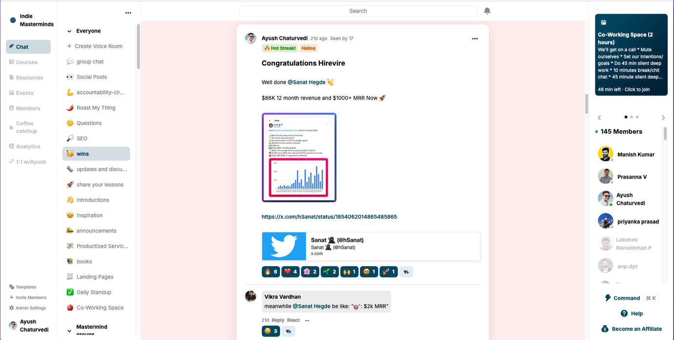 "Fantastic community with Ayush leading the way. Weekly co-working sessions and the cohorts are integral part of this community. The right amount of criticism and encouragement. I am bootstrapping a product and this community is instrumental in its growth.."βββββ